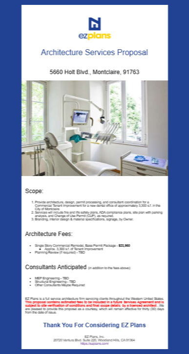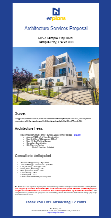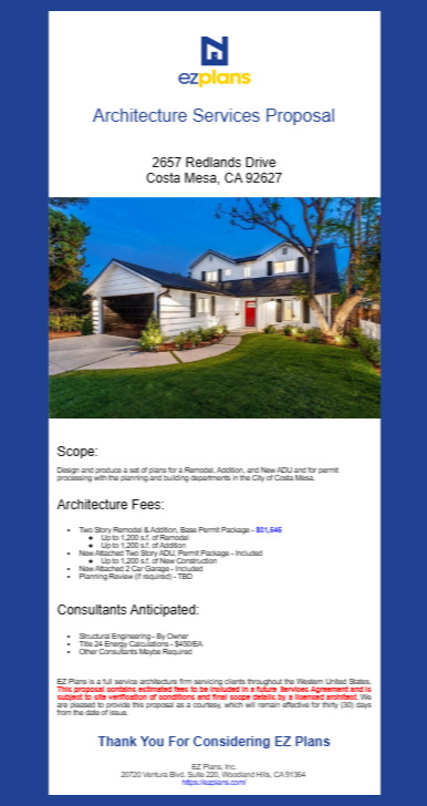 ArchiTech’s innovative pricing configurator enabled EZ Plans to establish and clearly outline its base pricing across all project types. The configurator allows for incremental fee adjustments based on critical factors such as square footage, project amenities, and additional services. Once the configurator is fully populated, it facilitates the auto-generation of proposals with just a click, significantly reducing time and operational costs. The tool has also enhanced EZ Plans' ability to convey and showcase its comprehensive range of services, which include design and permit processing, interior finishes, landscape services, contractor bidding, and construction administration.